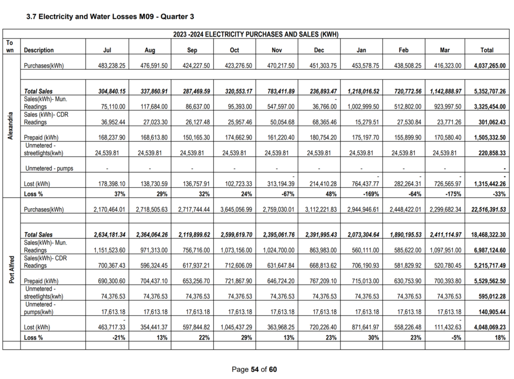 Ndlambe published the 3 tables shown below for Alexandria, Port Alfred, and the Overall electricity losses for Q1-Q3 2023/24